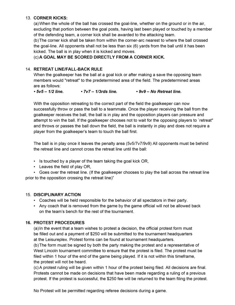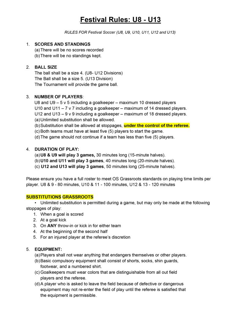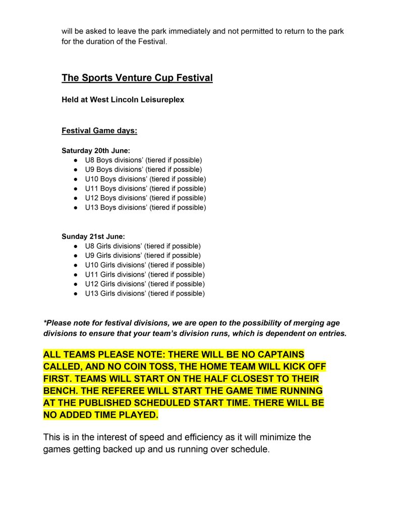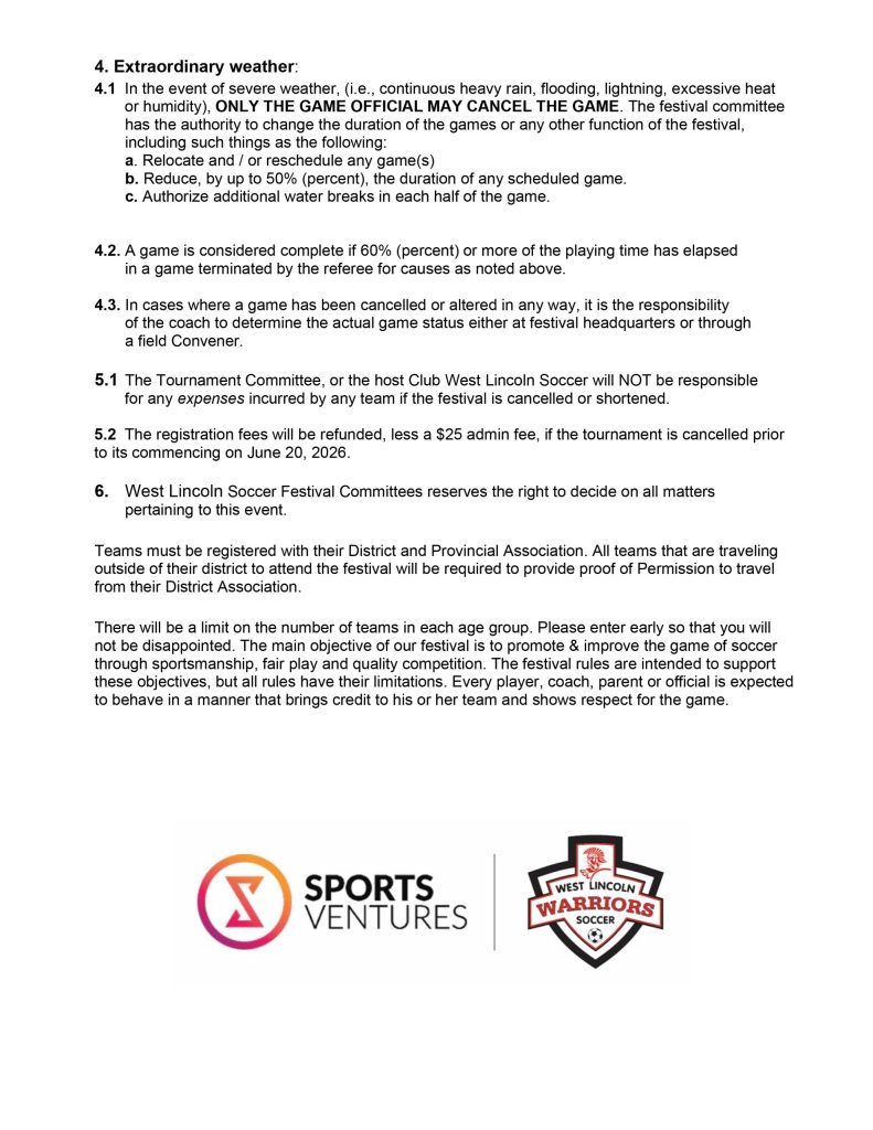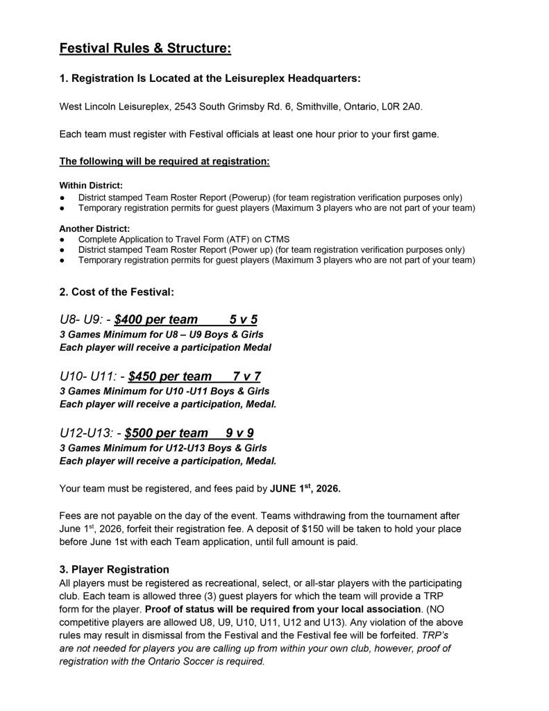 Read through below, or click link to download printable version: https://westlincolnsoccerclub.ca/wp-content/uploads/FESTIVAL_RULES_for_2026_SportsVenturesCup.pdf